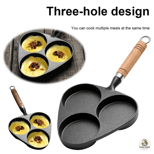 Poêle à crêpes fonte manche bois antiadhésive 3 trous